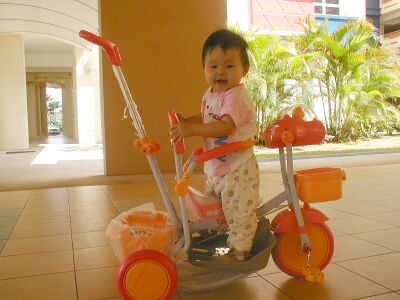 Standing on tricycle bought by Ivy's father. 21 Nov 04