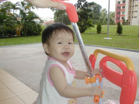 Her favourite position, pushing the tricycle. 28 Nov 04